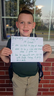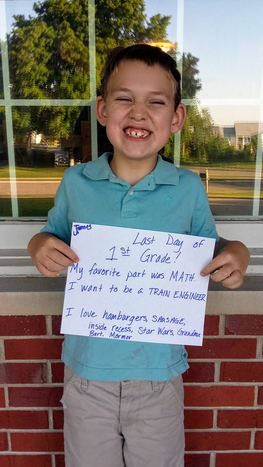 "My favorite part was Math. I want to be a train engineer. I love hamburgers, sausage, inside recess, Star Wars, Grandma Bert, Mormor."