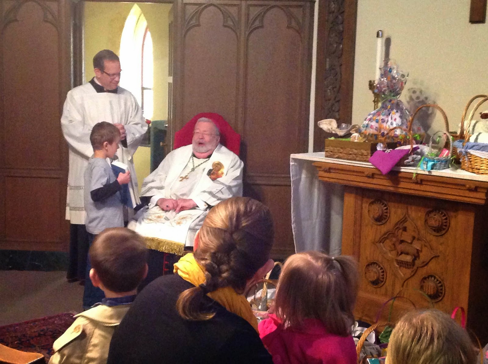But Holy Saturday started well, with my family and I attending the Blessing of the Easter Baskets at our Cathedral. Ben was able to "serve" and hold the book of blessings for the Bishop, who was a delightful ham and made everyone laugh repeatedly.