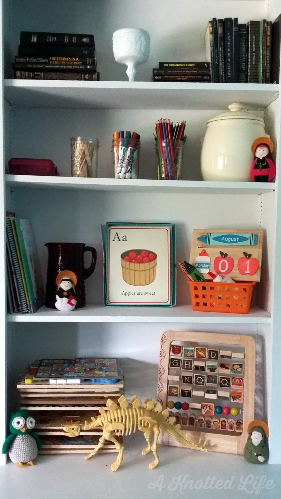 And I have changed up my shelves a bit to make things a bit more schoolish. We'll see how long this lasts but yay for mason jars, toys my kids were given, and Target dollar bins!