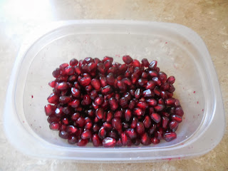 My new little treat is pomegranate seeds. I keep a container of them in the fridge and pretty much every time I open it up I grab a handful.