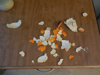 Want to hear one more thing about food? Sure ya do! Okay. Clementines are in season and they are so. flippin. good! Now in the past I have eaten clementines like a banshee when I was pregnant but that's not the case now. In case anyone is keeping track I am unpregnant right now. The neat thing is that all the kids are eating them too. Everyone grabs one, I start the peeling, they take over, Resa has juice running down her chin, JF keeps asking for more, and I find piles like this all over the house.