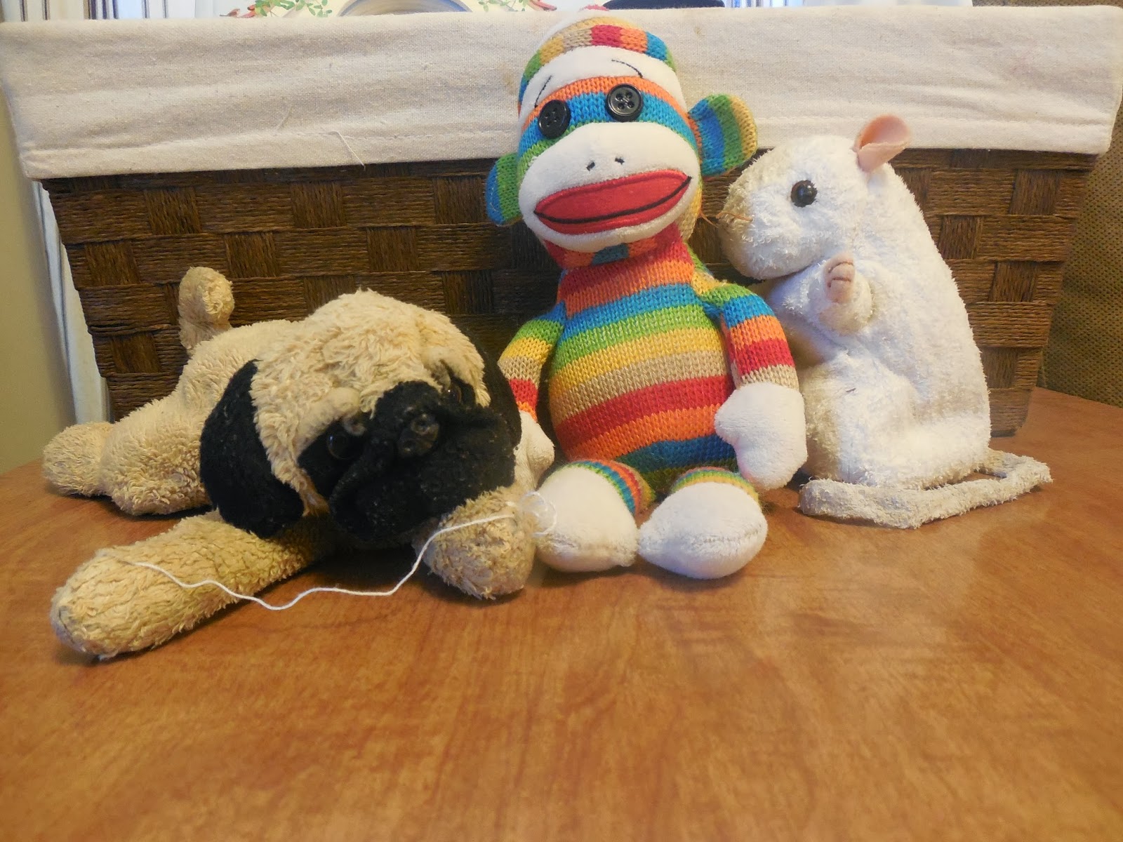 I rounded up Doggie Dog, Monkey, and Mousey Mouse and washed them so they wouldn't look so disgusting. (Does anyone else have kids who chew on their animals? Sometimes it gets so bad that poor Mousey Mouse's tail is kinked and stiff.)